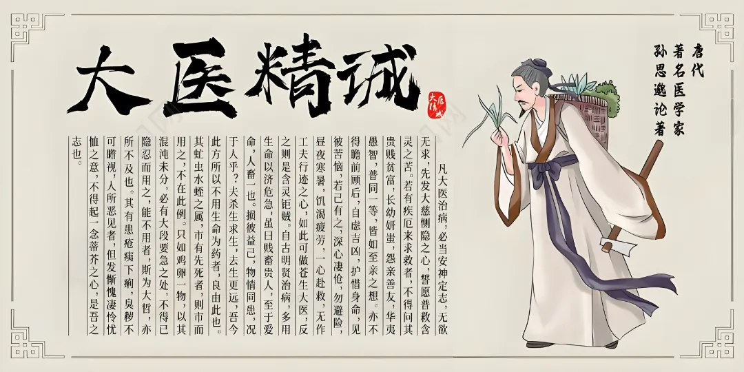 凡大医治病,必当安神定志,无欲无求,先发大慈恻隐之心,誓愿普救含灵之苦。若有疾厄来求救者,不得问其贵贱贫富,长幼妍媸,怨亲善友,华夷愚智,普同一等,皆如至亲之想,亦不得瞻前顾后,自虑吉凶,护惜身命。见彼苦恼,若己有之,深心凄怆,勿避险巇、昼夜、寒暑、饥渴、疲劳,一心赴救,无作功夫形迹之心。如此可为苍生大医,反此则是含灵巨贼。自古名贤治病,多用生命以济危急,虽曰贱畜贵人,至于爱命,人畜一也。损彼益已,物情同患,况于人乎!夫杀生求生,去生更远。吾今此方所以不用生命为药者,良由此也。其虻虫、水蛭之属,市有先死者,则市而用之,不在此例。只如鸡卵一物,以其混沌未分,必有大段要急之处,不得已隐忍而用之。能不用者,斯为大哲,亦所不及也。其有患疮痍、下痢,臭秽不可瞻视,人所恶见者,但发惭愧凄怜忧恤之意,不得起一念蒂芥之心,是吾之志也。