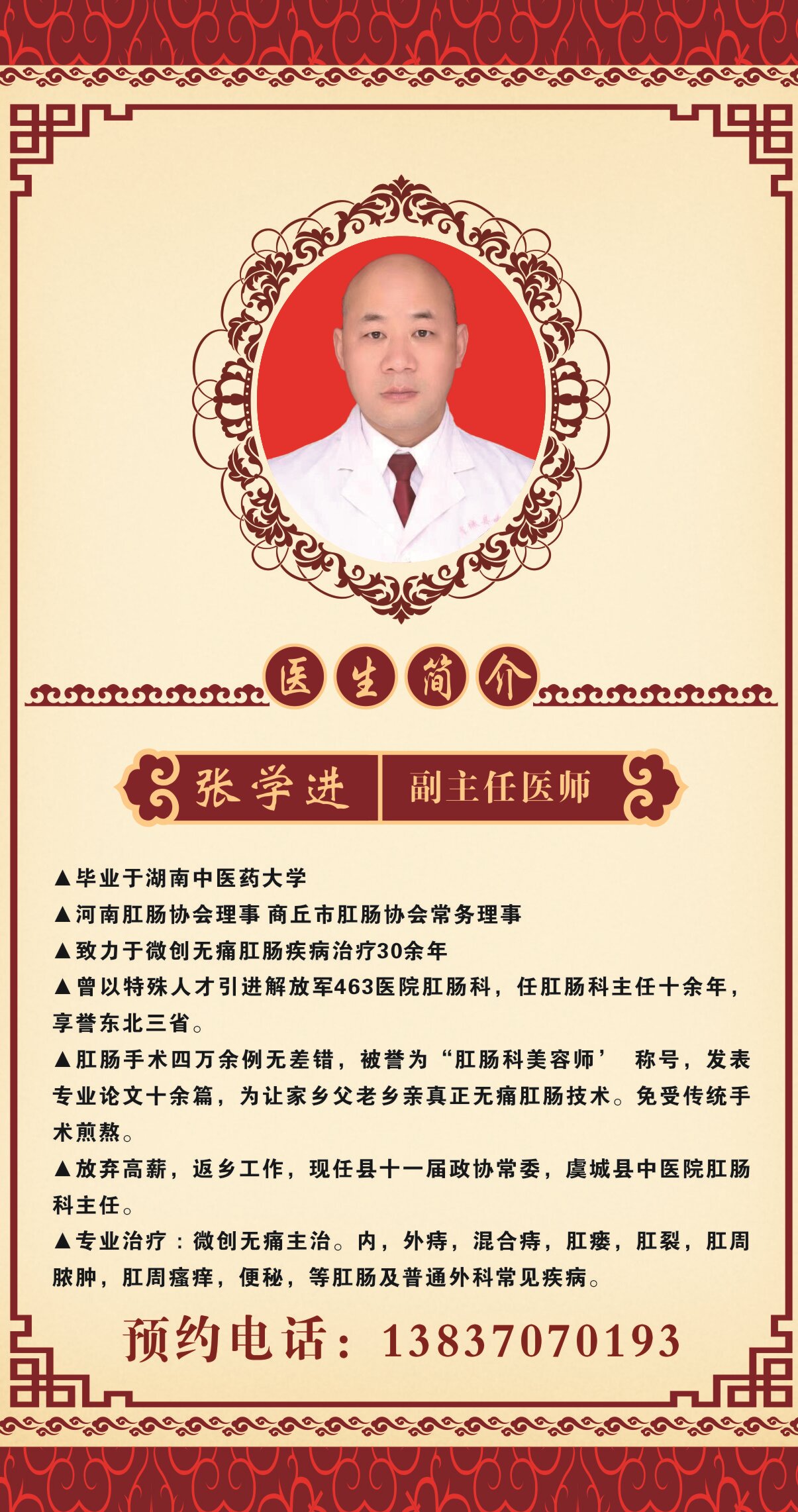虞城县中医院肛肠科成立于1983年是我县最早成立肛肠专科,经过数代肛肠科医生的不懈努力我科已有市重点专科发展为河南省重点专科,享誉豫东地区自2014年特聘原解放军463医院肛肠科主任张学进返乡工作,并开设专科病区,拥有了韩国产电子肛门镜,微创肛肠治疗仪,LC离子熏洗仪微波机,红光机肛肠治疗仪,肠道透析整复系统,等设备,我们的微创肛肠技术属豫东首例科室理念“专业带动全局,特色推助发展,服务赢得未来”为战略目标。肛肠科以“专业技能扎实,临床经验丰富,为患者解除痛苦”为己任,以“技术与服务”为核心竞争力,凭借“执着医志,诚信医德,精湛医术,严谨医风”致力于专业研究。并与全省每位著名专家建立技术合作,突破专项技术难题,成功治愈了各种复杂、疑难肛肠病,并运用中医、中药、中药熏洗、灌肠等中西结合方式治疗肛门疾病,个体化的诊疗施治方案,保障了疗效,专业,微创,轻松。使患者受益非浅,赢受爱戴。