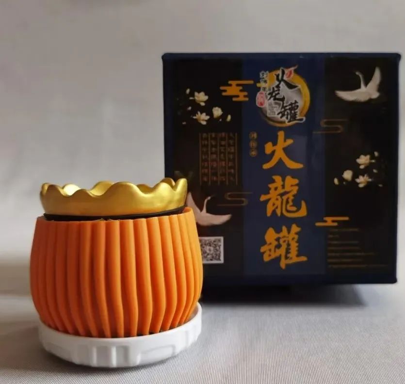 火龙罐由玄石加特殊紫砂,经过特殊工艺烧制而成,根据身体不同部位的操作要点,设计成不同尺寸的罐体。罐内固定道地药材——蕲艾,点燃后生发纯阳之性,犹如火龙之口,助身体驱寒、除湿、化淤,此罐因此取名为“火龙罐”。
